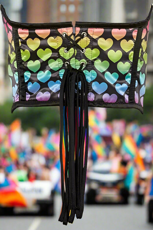 Rainbow Hearts Print Satin Mini Cincher Corset