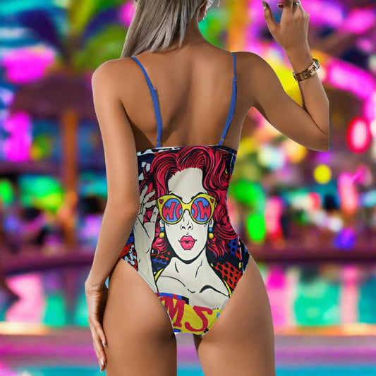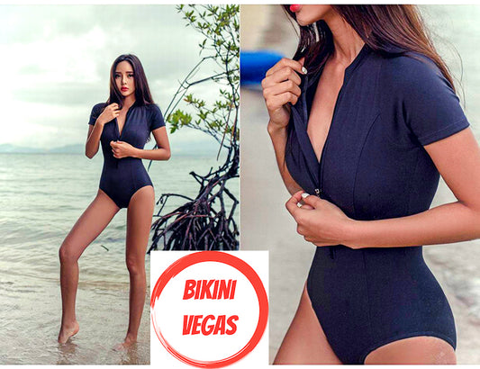 Black One Piece Swimsuit with Short Sleeves and Front Zipper