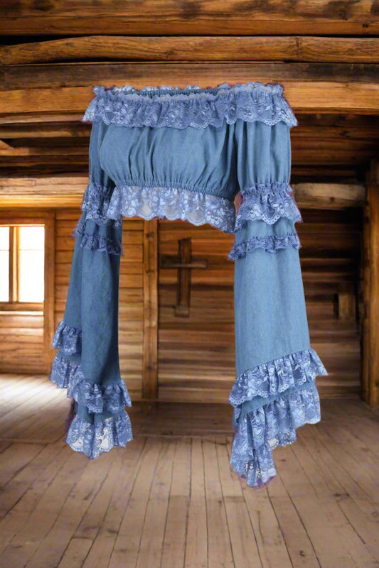 Blue Denim Color Smocked Flare Sleeve Peasant Top
