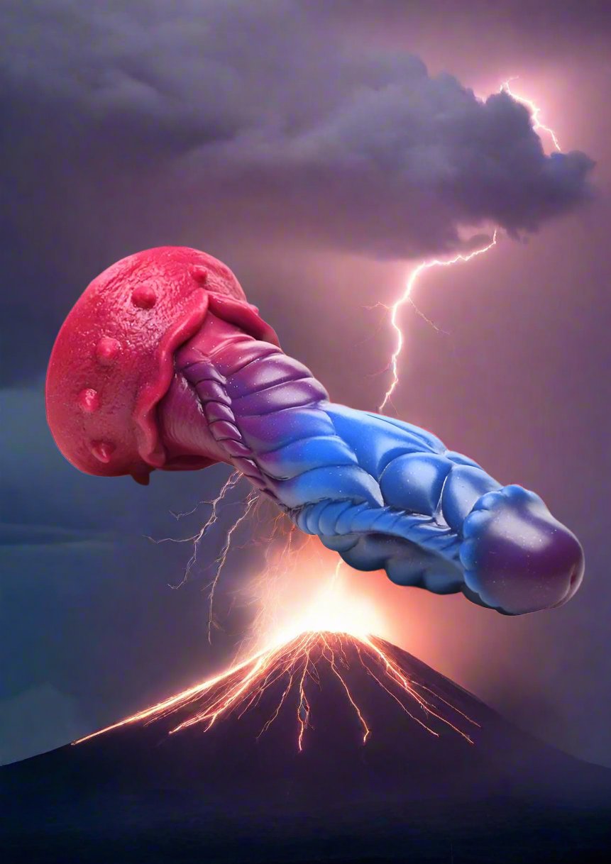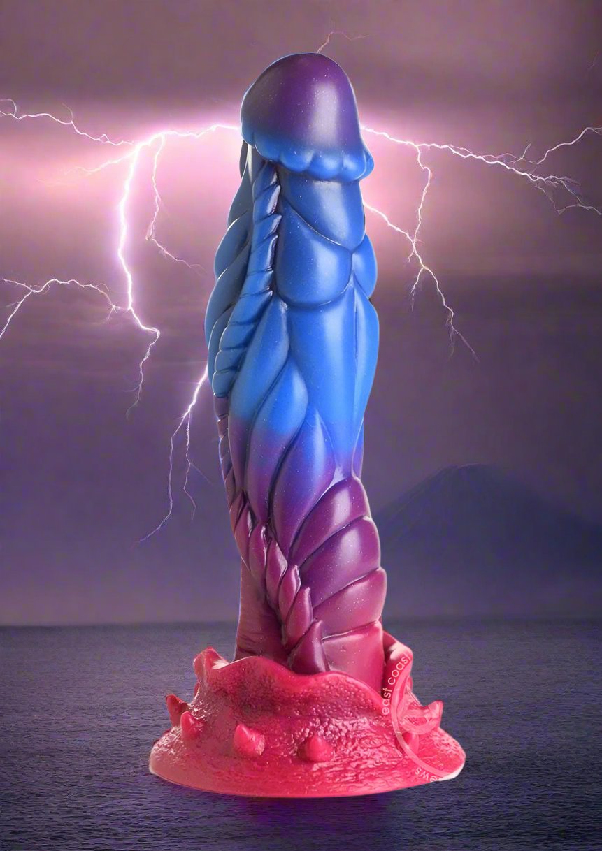Immerse yourself in an otherworldly encounter from a cosmic lover with an irresistible extraterrestrial appendage. Their cock's vibrant hues of blue, purple, and pink shimmer against the backdrop of the starlit night, captivating your senses. If you look closely, you'll see the glitter scattered throughout their rod that mimics the starlit sky. The round head of the cock is tapered so it easily glides inside with the help of water-based lube. Prepare to moan out loud as you experience an array of sensations from large bumps, intricate roped lines, and a thick ridge that adorns the center, creating a symphony of stimulation that awakens every part of you. Crafted from premium, phthalate-free silicone, this seductive alien companion is body-safe. Its firm yet flexible design has a sturdy core and a squishy outer layer that molds to the unique curves of your body, offering a tailored fit for your intimate desires.