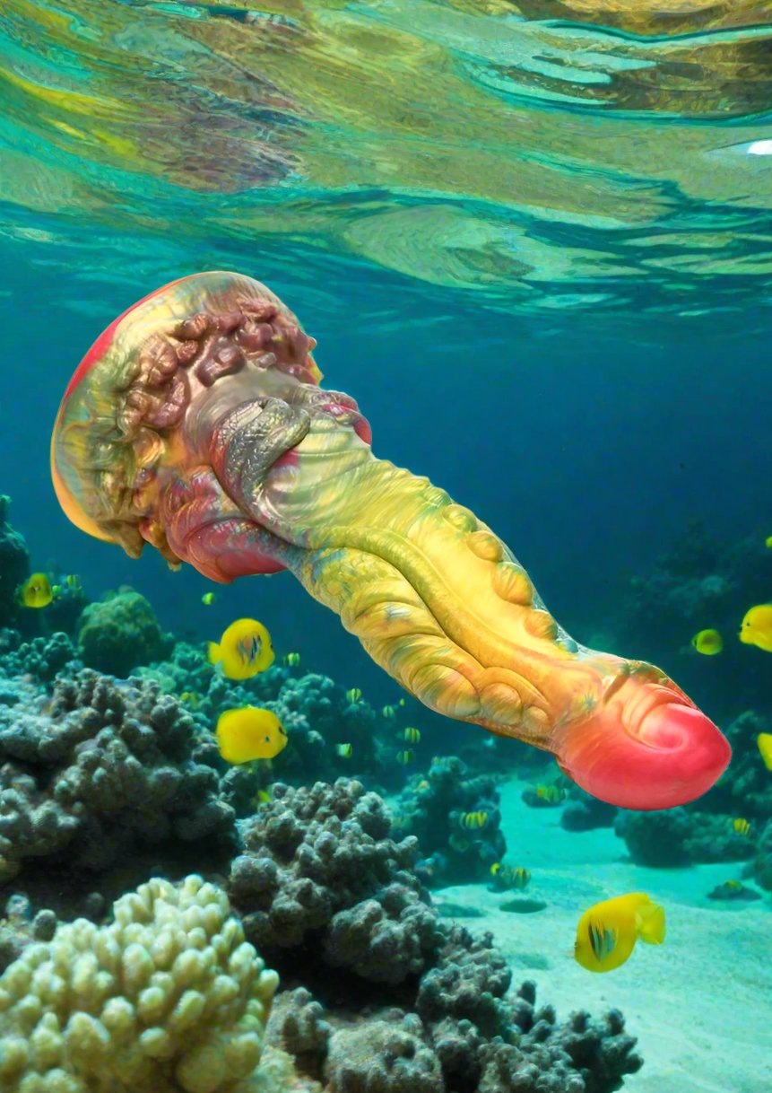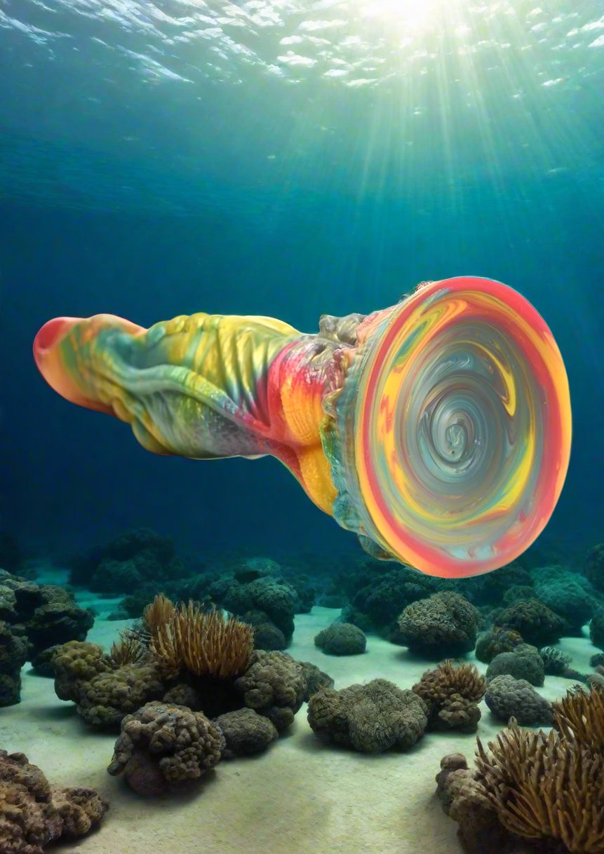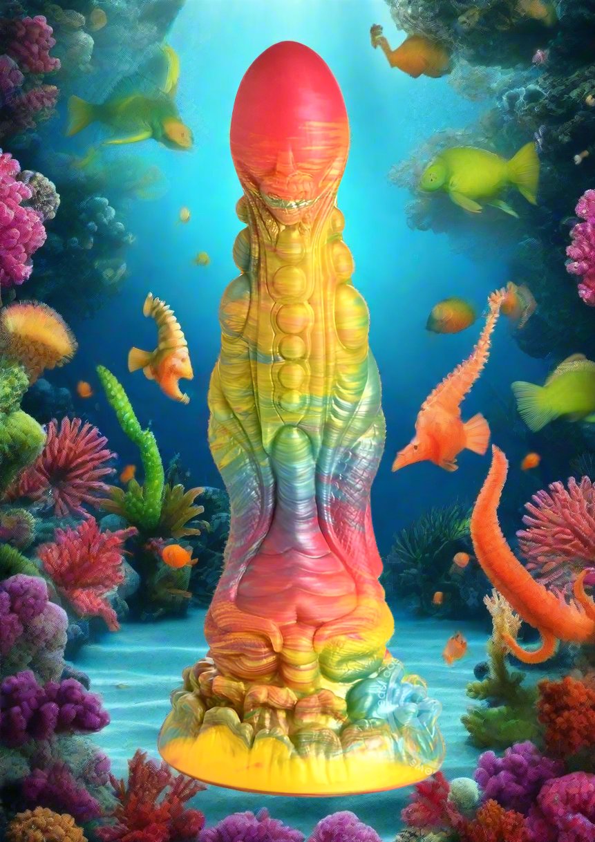 Ready to go deep? This extra long Majestic Merman dong is perfect for exploring the depths of your desires! With iridescent rainbow colors that really pop out among your other toys and gear, this toy is eye-catching and beautiful! The S-shaped curve to the shaft helps it hit all the right spots. As it is penetrating you thoroughly with over 10 inches of length, the bumps, grooves, ridges, swirls, curves and nubs stimulate you even more! This meaty dong has a tapered head for easier insertion, but a girthy, thick body that will stretch your limits! Made out of premium, flexible, phthalate-free silicone, this dong is body-safe and best used with water-based lubricants only. Enjoy hands free rides due to the strong suction cup base! Invite a partner to indulge in kinky cosplay or fantasy roleplay and use their favorite harness to transform this dong into a strap-on! Afterward, make sure to wash it with warm water and mild soap, then spray it with a toy cleaner and air-dry. Keep out of direct sunlight and heat.