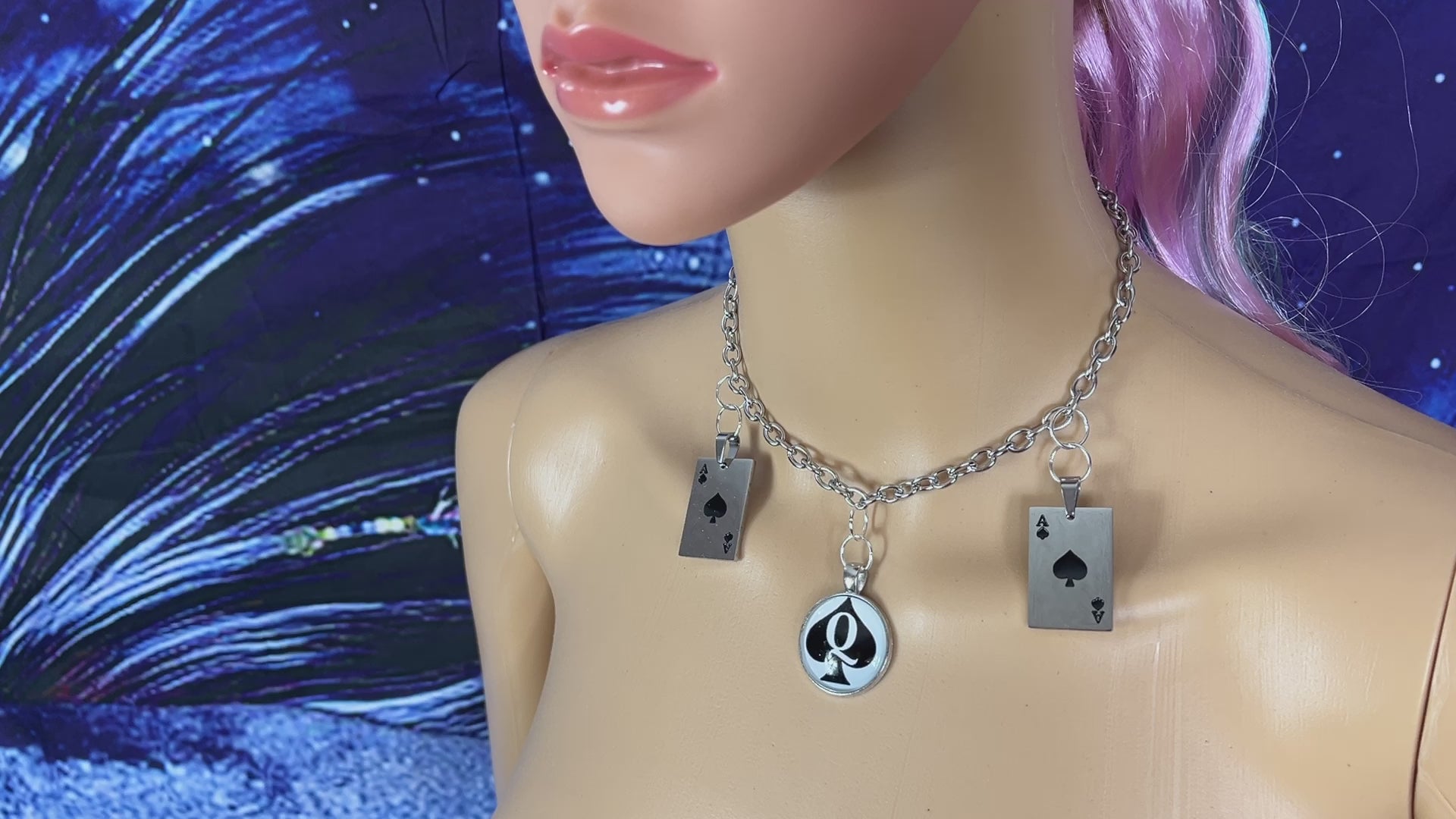 This fun necklace features a Queen of Spades pendant surrounded by an Ace of Spades pendant on either side.