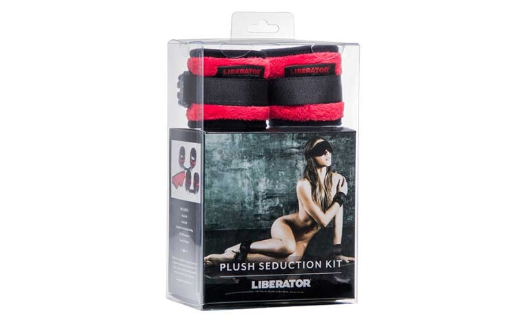 Wrists bound. Thighs spread. Ankles locked into place. With a few snaps, you've forged a new space for play. Familiar landmarks become unexplored territory. Your lover's body is a universe of touch and tease, pinch and pleasure, and punish and reward. Each tether terminates in a lasso that you can loop around bed posts or furniture. Comfy cuffs are lavishly lined in incredibly soft faux fur. These accouterments work with Liberator Shapes and Black Label products. The Liberator Deluxe Plush Cuff Kit includes everything you need to tenderly tie-down and tease a rebellious lover.