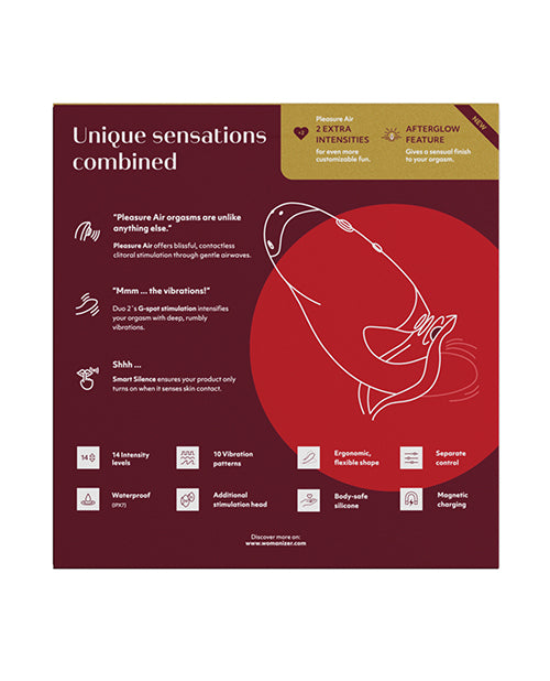 DUO 2 is a unique premium rabbit toy – a Pleasure Air clitoral stimulator and powerful G-Spot vibrator combined to create advanced, blended orgasms. Pleasure Air surrounds the clitoris with pulsating waves and gentle suction leading to a new kind of extraordinary orgasm. Dual Stimulation - DUO 2 simultaneously targets the G-spot with deep rumbly vibrations and the clitoris with suction-like Pleasure Air stimulation, creating satisfying blended orgasms. The flexible inner arm is curved upwards to target the G-spot with gentle vibrations. DUO 2 is waterproof (IPX7), making it easy to clean and enjoy anywhere outside of the bedroom. Find your rhythm with 10 different vibration patterns — from the wave to the cha-cha or just pure steady vibrations. 14-Intensity Levels - Now with an additional two intensity levels, DUO 2 can offer the right setting for every mood. Afterglow - By briefly pressing the power button, DUO 2 will quickly revert to a lower setting for a relaxing end to an orgasm. Smart Silence - DUO 2 automatically turns off when not in contact with skin.